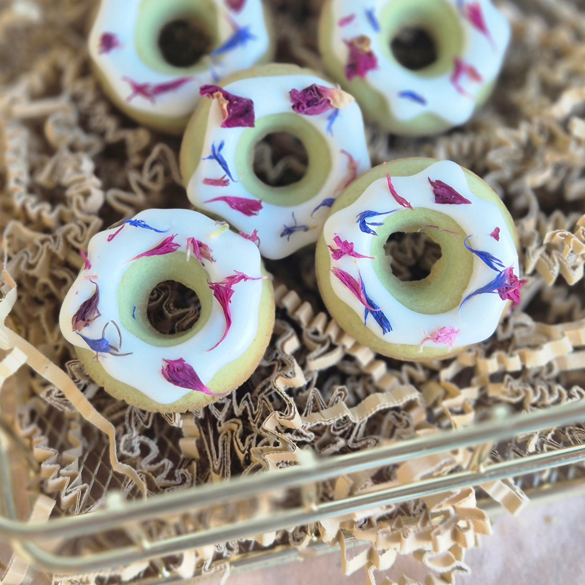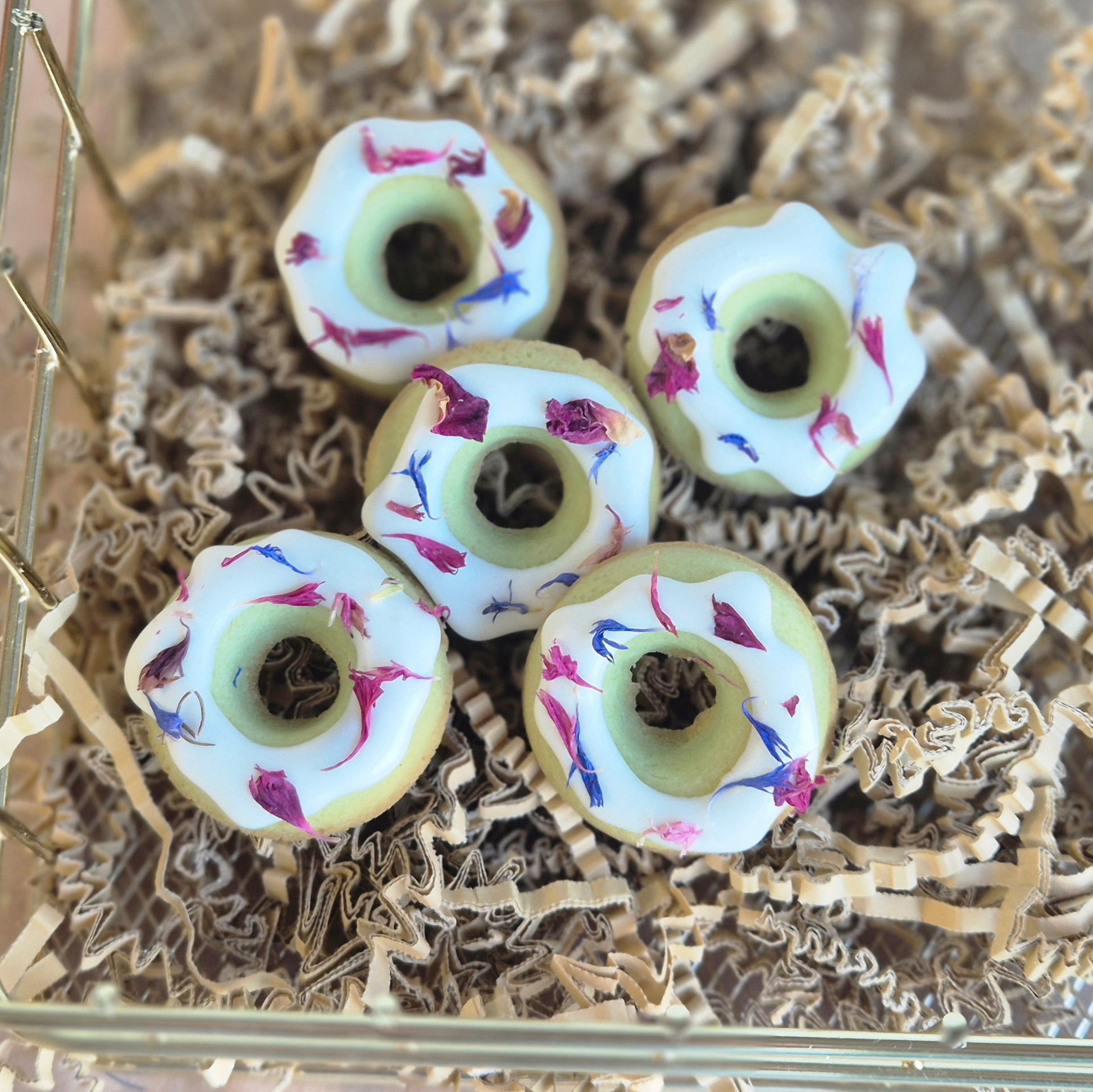 Pistache donut koekjes met eetbare bloemetjes als decoratie
